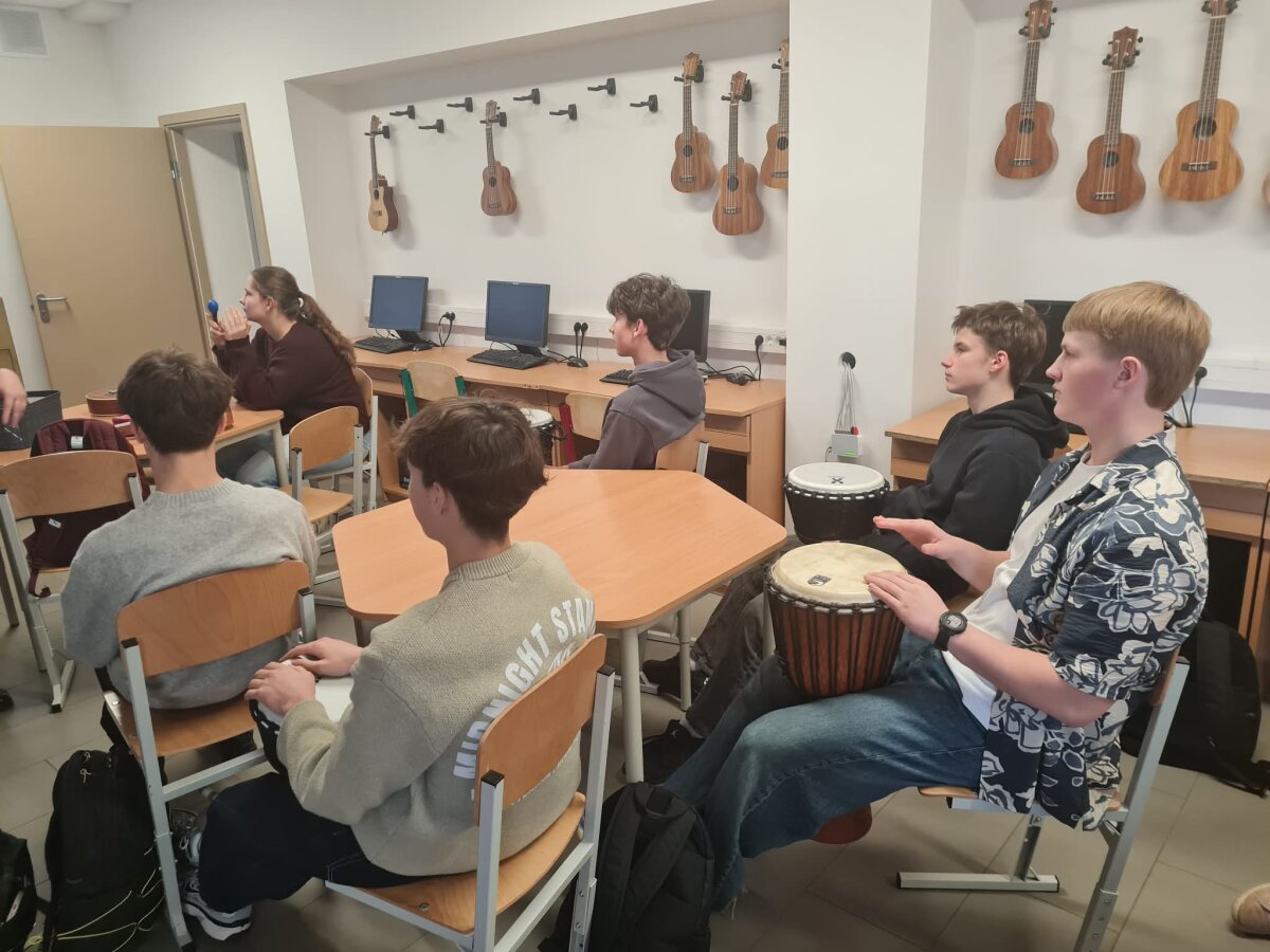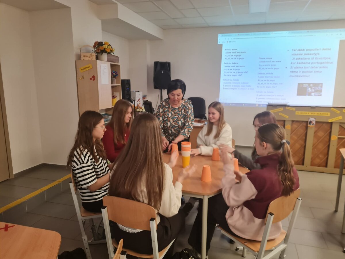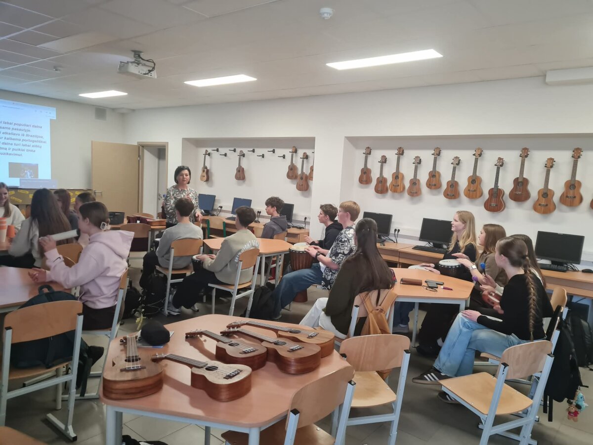 Kovo 27 dieną integruotoje muzikos ir anglų kalbos pamokoje mokiniai susipažino su portugalų muzika, jos istorija. Taip pat buvo mokomasi atlikti tris dainas portugališkai, akomponuoti jas liaudiškais instrumentais ir pasiruošti portugalų grupės sutikimo koncertui jų Erasmus+ mobilumų metu mūsų gimnazijoje.