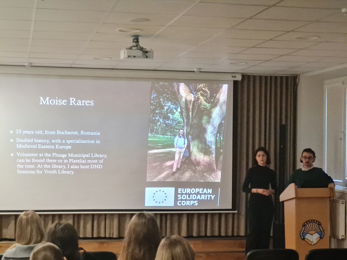 Kovo 17 dieną dviejų integruotų istorijos ir anglų kalbos pamokų metu IIe klasės mokiniai susitiko su savanoriais, dirbančiais Plungės viešojoje bibliotekoje. Moise Rares iš Rumunijos ir Anastasia Kobylchak iš Ukrainos gimnazistams pasakojo, rodė autentišką filmuotą medžiagą apie nepriklausomybės kelią Rumunijoje. Vėliau mokiniai atsakinėjo klausimus, lygino Rumunijos ir Lietuvos žmonių gyvenimą tuo laikotarpiu, diskutavo, darė išvadas.