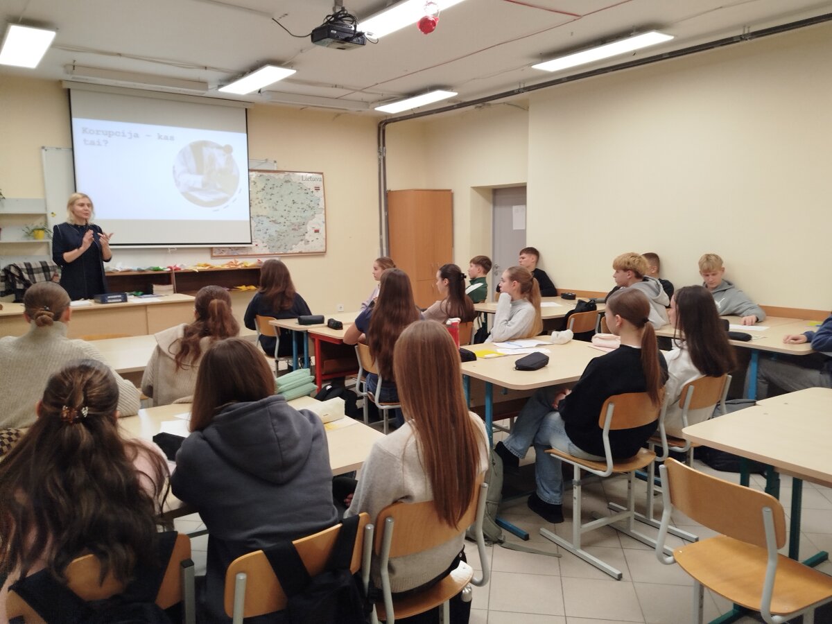 Ie ir If klasių gimnazistai per pilietiškumo pagrindų pamokas „Antikorupcija – kuriame skaidrią visuomenę“ gilinosi į korupcijos sąvoką, jos apraiškas ir daromą žalą valstybei bei visuomenei. Mokiniai žaidė edukacinį stalo žaidimą „Antikoruptika“, kuriame sprendė įvairias viešojo gyvenimo situacijas. Šios užduotys skatino apmąstyti, kaip kiekvienas gali prisidėti prie skaidresnės, saugesnės ir teisingesnės valstybės kūrimo. Pamokos pabaigoje mokiniai pasitikrino savo žinias spręsdami teminius testus.