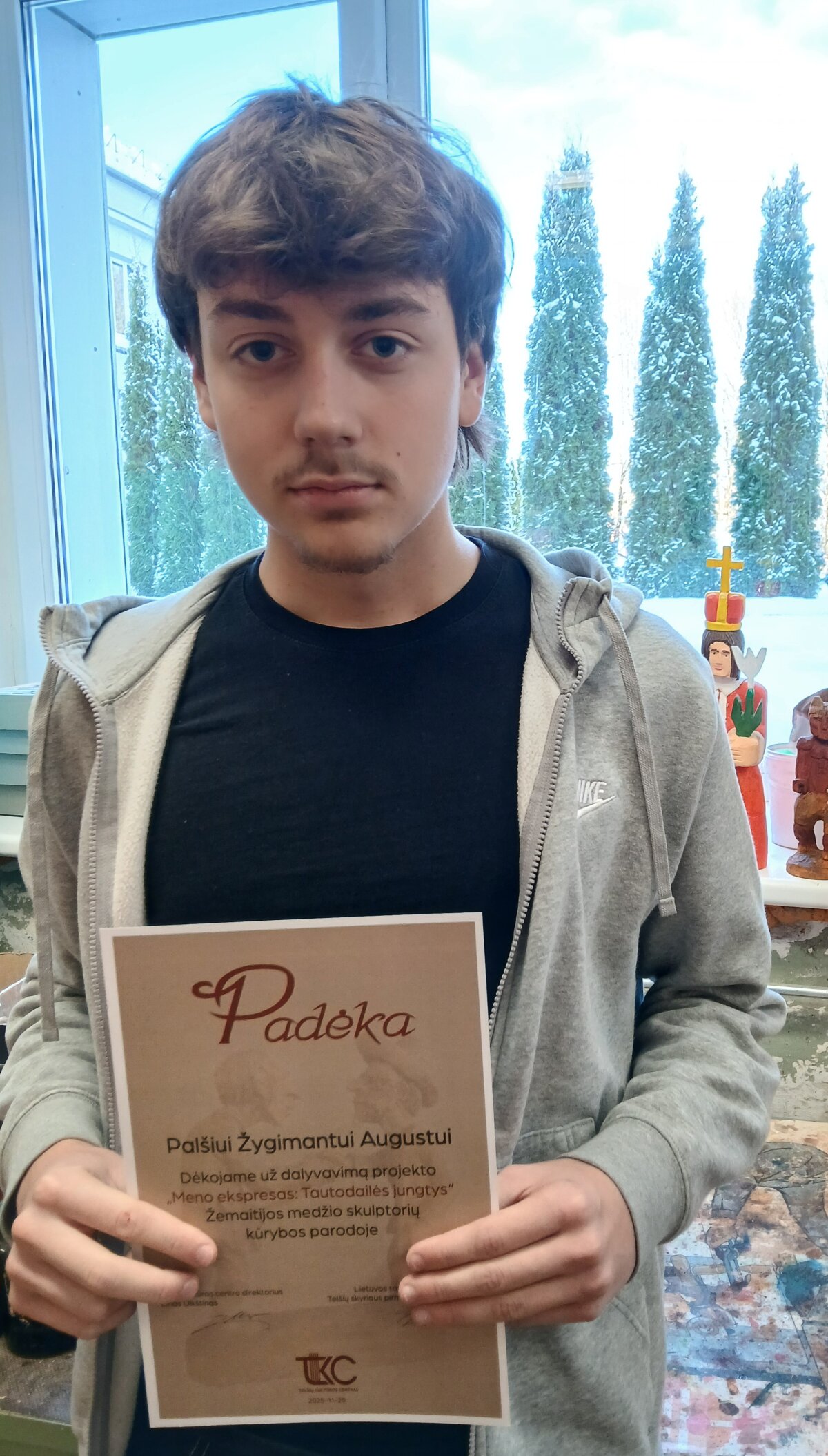 Šių mokslo metų pirmąjį pusmetį gimnazistai dalyvavo įvairiose veiklose. 2025 m. spalio 20 d. Henrikas Jucys, Simonas Mickevičius (I a kl.) ir Vilius Buivydas (II b kl.) dalyvavo Telšių Žemaitės gimnazijos Etno savaitės „Etnoreidas‘‘ projekte. Vaikinai kartu su technologijų mokytoju vedė medžio drožybos edukaciją, pristatė savo darbus, mokė raižyti geometrinius ornamentus ant medinių paukštukų ir prieverpsčių. Telšių gimnazistai turėjo progą susipažinti su tradicinės medžio drožybos subtilybėmis, išbandyti savo jėgas ir pajusti tikrą kūrybos džiaugsmą. Taip pat mūsų mokinių medžio skulptūros buvo pristatomos ,,Žemaitijos skulptorių kūrybos parodoje“, kuri vyko spalio 20 d. – lapkričio 25 d. Telšių kultūros centre. Lapkričio 25 d. Telšių kultūros centre vyko konferencija ,,Medžio skulptūra – daugialypė prasmė‘‘, kurioje dalyvavo Žygimantas Augustas Palšis (III a kl.), Jokūbas Bružas (III d kl.), Henrikas Jucys (I a kl.), Kristupas Ciparis (I a kl.). Vaikinai apžiūrėjo parodą, išklausė konferencijos pranešimus, kiekvienam buvo įteiktos padėkos ir nuotraukų rinkinys su jų ir visos parodos autorių skulptūromis. Pusmečio veiklą vainikavo dalyvavimas XIX respublikinėje Prakartėlių konkursinėje parodoje Rokiškio krašto muziejuje, kuri vyko gruodžio 5 d. – sausio 10 d. Konkursui savo prakartėles pristatė Kristupas Ciparis (I a kl.) ir Jokūbas Bružas (III d kl.). Jokūbo prakartėlė 16-25 metų kategorijoje laimėjo III vietą, mokinys buvo apdovanotas 300 eurų paskatinamąja premija.